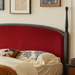 Beneath the headboard’s soft silhouette, a low-profile oak base grounds the design in timeless strength, its dark-stained finish accentuating the wood’s natural character. The bold velvet insert, available in curated jewel tones, draws the eye and invites you to rest against its inviting embrace.