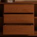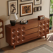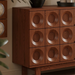 Charlton transforms everyday storage into a showcase of craftsmanship. Its warm oak façade is divided into three sections: the center houses three deep, handle-less drawers with a slender perimeter reveal, while each flanking door is adorned with a grid of concave circular pulls—six per side—carved directly into the wood for a seamless, sculptural effect.